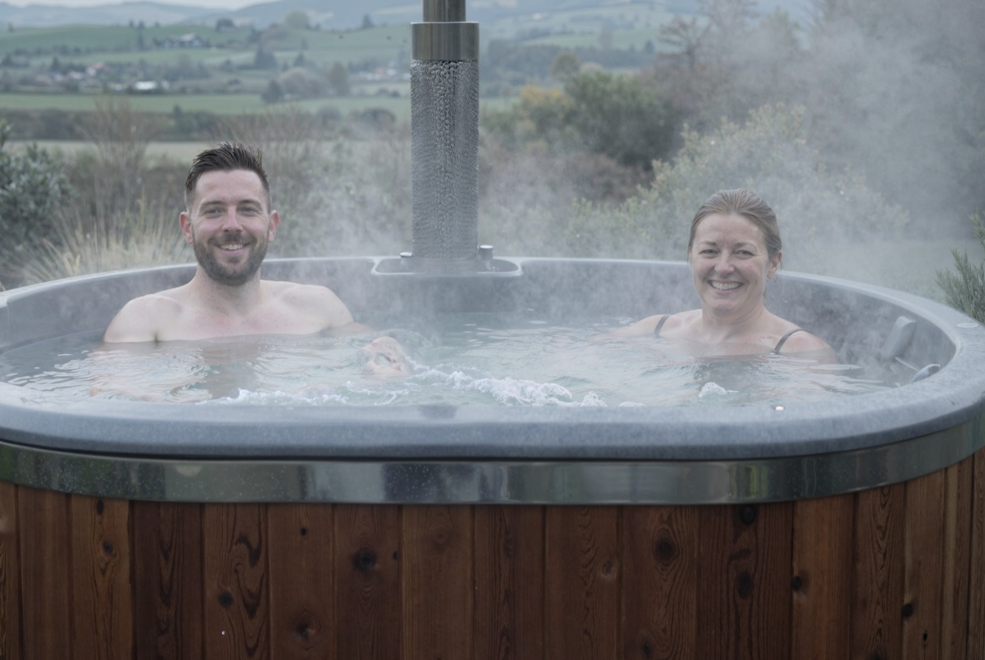 Top up the tub, load dry hard or softwood into the external firebox, and spark it. The flame heats a stainless exchanger; warm water rises, cool water sinks—silent, pump-free circulation that evens out the heat fast.